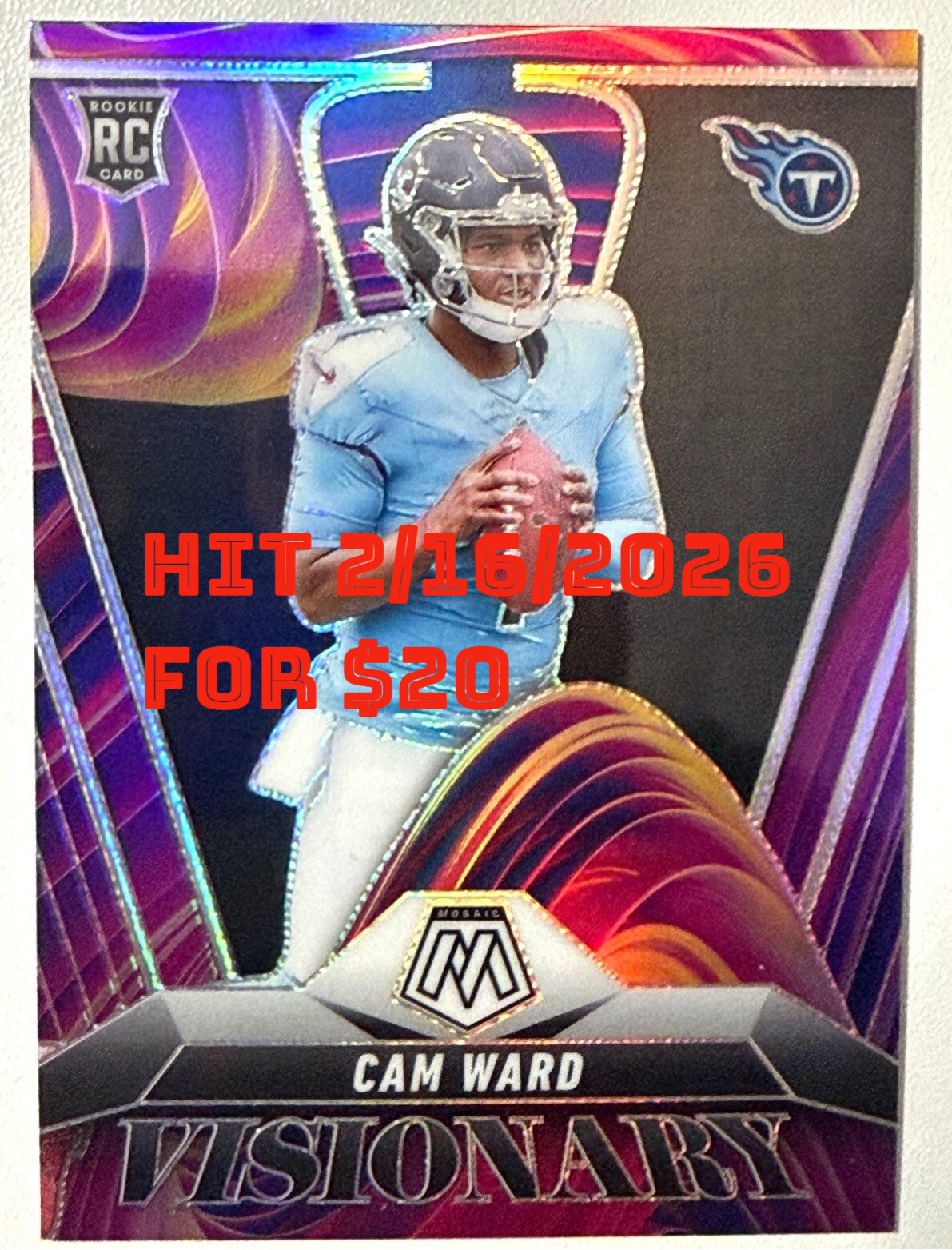 - HIT 12. NFL 2025 Mosaic Cam Ward Visionary "Case Hit Rookie Card" -Raw