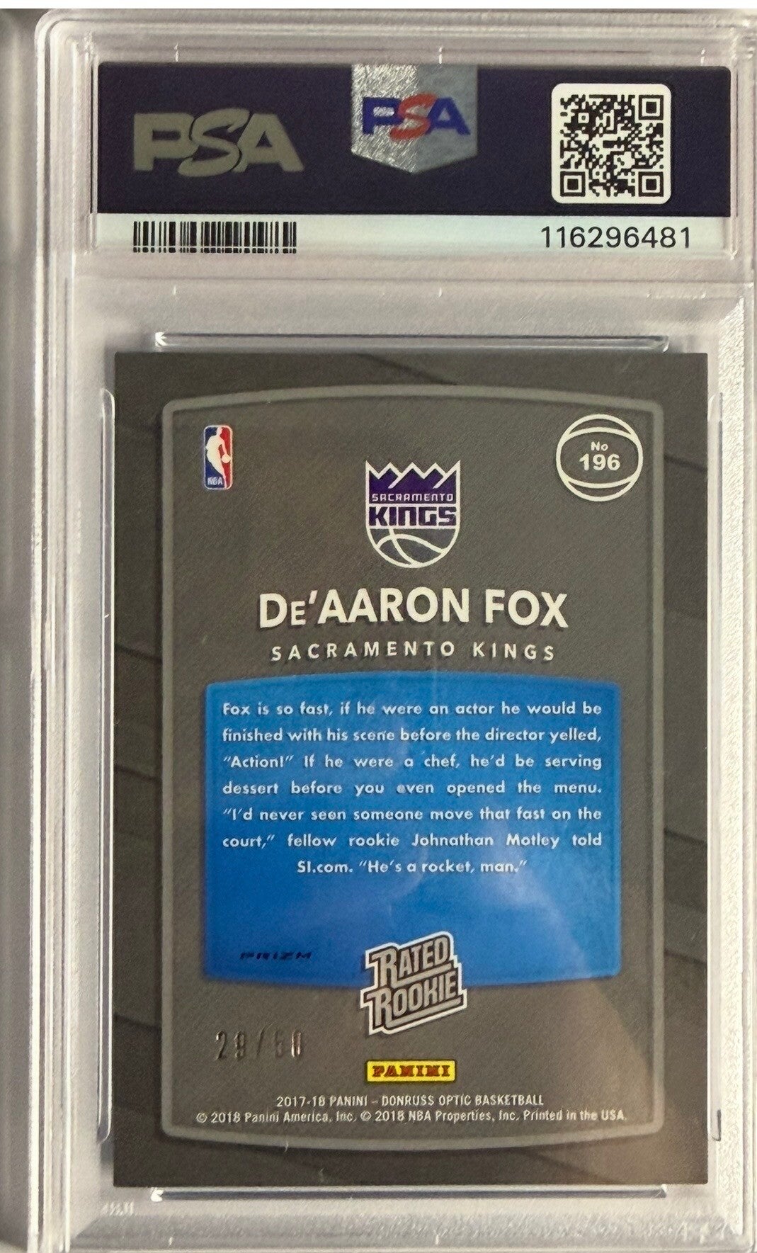 2017 Donruss optic Deaaron fox fast break blue psa 9